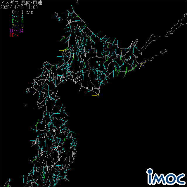 北海道 アメダス風向風速(気象庁発表) 2025年4月15日11時(JST)