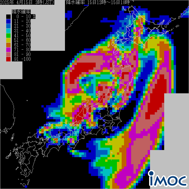 日本 降水確率(気象庁提供) 2025年4月15日(火)12時~18時(JST)