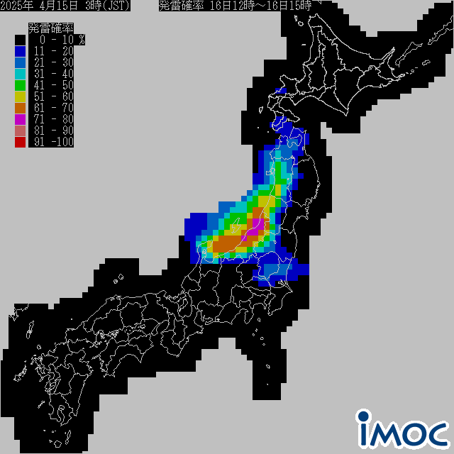 日本 発雷確率(気象庁提供) 2025年4月16日(水)12時~15時(JST)