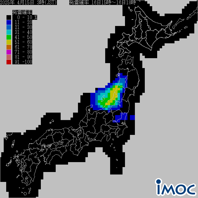 日本 発雷確率(気象庁提供) 2025年4月16日(水)15時~18時(JST)