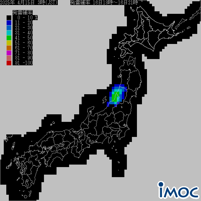 日本 発雷確率(気象庁提供) 2025年4月16日(水)18時~21時(JST)