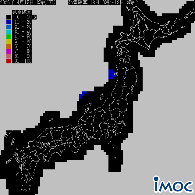 日本 発雷確率(気象庁提供) 2025年4月18日(金)0時~3時(JST)