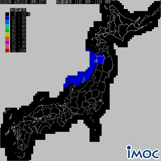 日本 発雷確率(気象庁提供) 2025年4月18日(金)3時~6時(JST)