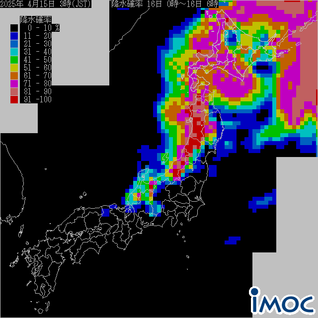 日本 降水確率(気象庁提供) 2025年4月16日(水)0時~6時(JST)