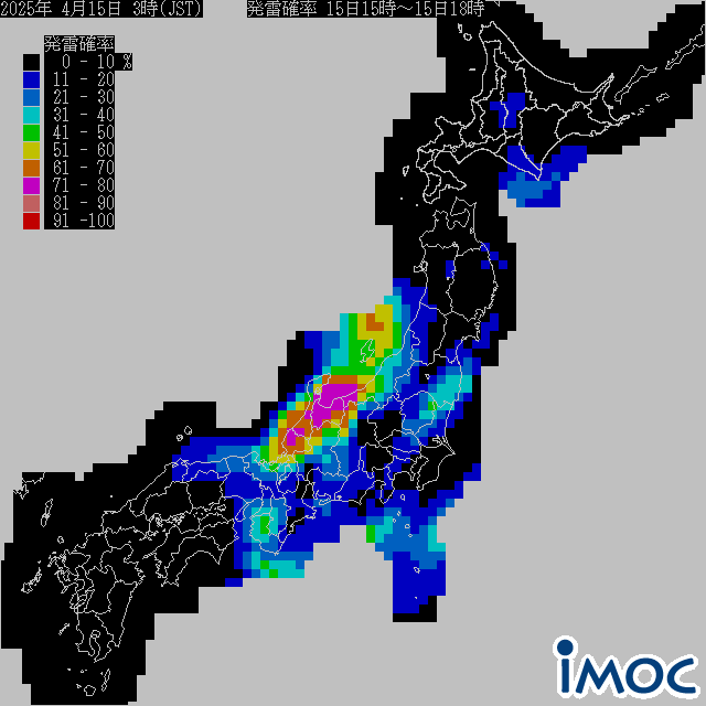 日本 発雷確率(気象庁提供) 2025年4月15日(火)15時~18時(JST)