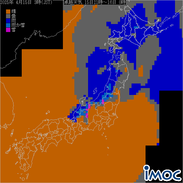 日本 卓越天気(気象庁提供) 2025年4月15日(火)21時~24時(JST)