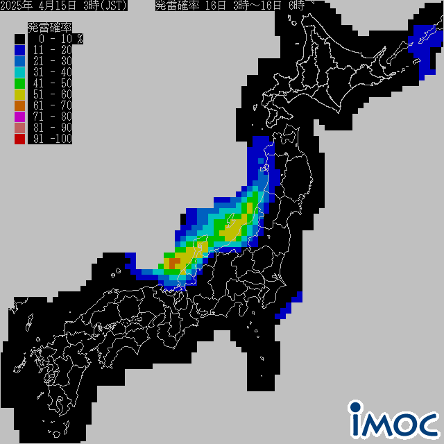 日本 発雷確率(気象庁提供) 2025年4月16日(水)3時~6時(JST)