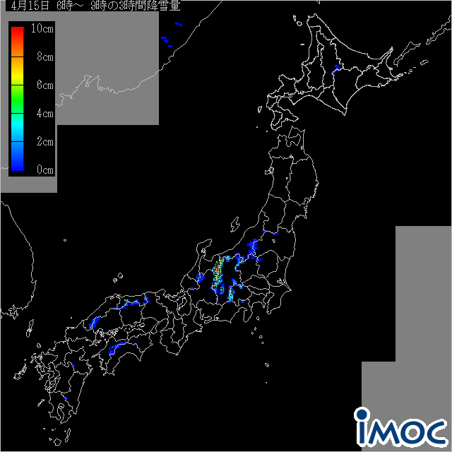 日本 3時間降雪量(気象庁提供) 2025年4月15日(火)6時~9時(JST)