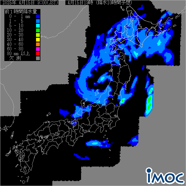 日本 10時間後降水短時間予想(気象庁提供) 2025年4月15日19時(JST)