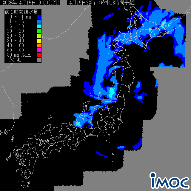 日本 13時間後降水短時間予想(気象庁提供) 2025年4月15日22時(JST)
