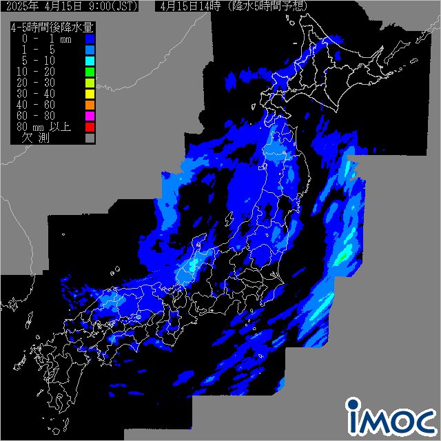 日本 5時間後降水短時間予想(気象庁提供) 2025年4月15日14時(JST)