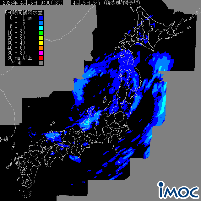 日本 6時間後降水短時間予想(気象庁提供) 2025年4月15日15時(JST)