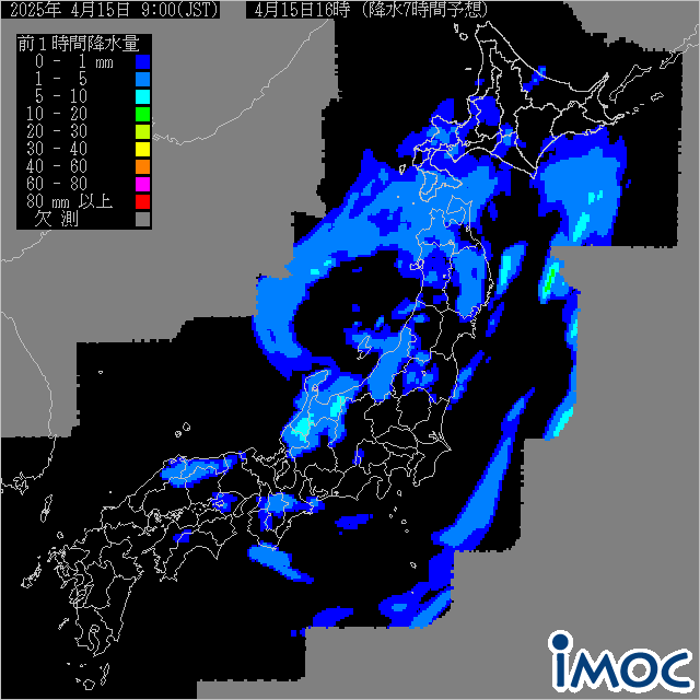 日本 7時間後降水短時間予想(気象庁提供) 2025年4月15日16時(JST)