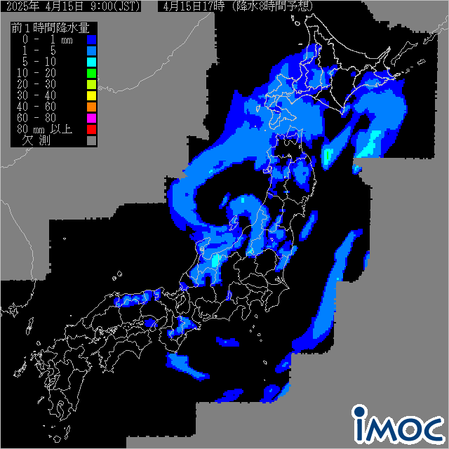 日本 8時間後降水短時間予想(気象庁提供) 2025年4月15日17時(JST)