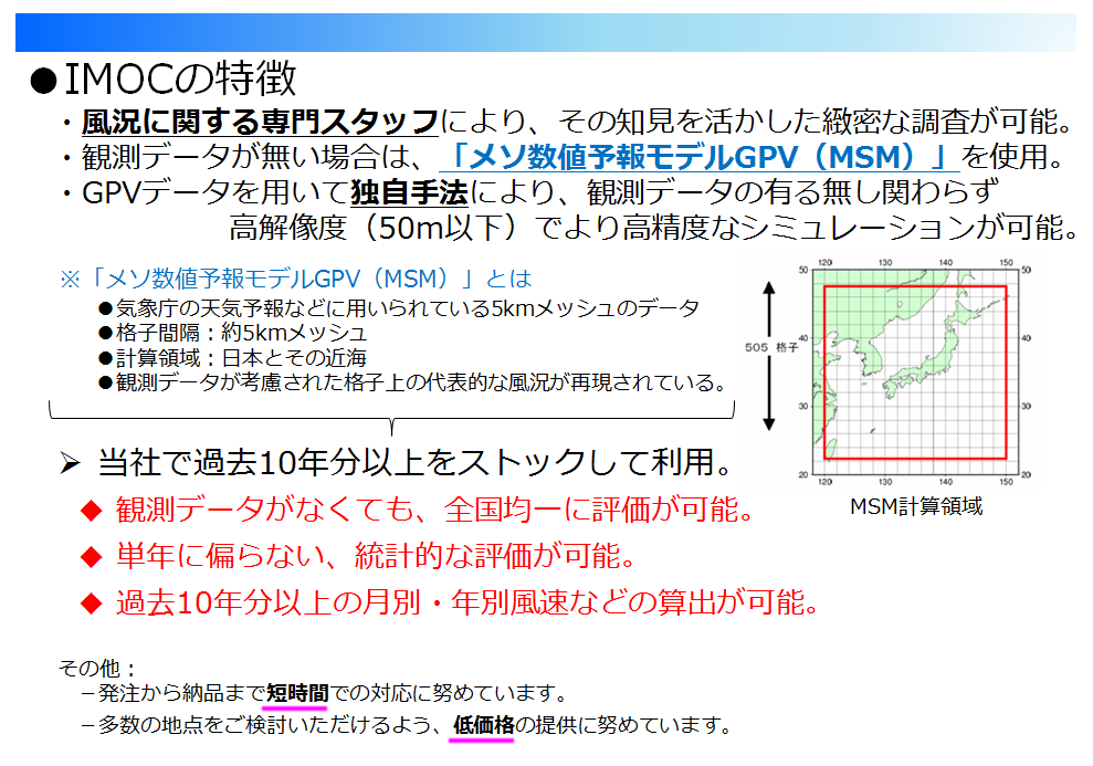 MSM(5kmメッシュ)によりハブ高さの風況を簡易予測。 |